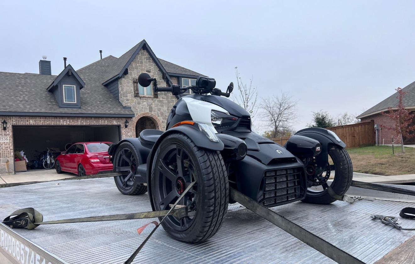 Secure motorcycle towing using proper straps and equipment to prevent damage.